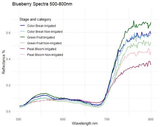 Various spectra of blueberry samples and pixels were observed to assess radiometric calibration and provide visual representation. The critical analysis, however, was using these spectra in development of the spectral variables, being the calculations of the vegetation indices and band resampling values. Nonetheless, the signatures can showcase information of interest. Figure 4 plots the median value signatures of combined samples, one from each field over each development stage. As can be seen in the figure, the spectra of peak bloom in the shades of pink closely align in the 500 to 700 nm range, but diverge after where the reflectance of the non-irrigated field shows higher than the irrigated. The reflectance of green fruit (shades of green) and color break (shades of blue) differ from the first stage where the irrigated signatures have higher reflectance rates than the non-irrigated, although the spectra of color break have similar values in the higher section of the spectrum. The difference of the irrigated and non-irrigated spectra of green fruit are also much larger than that of color break. These median reflectance spectra display the collected data in a raw form, but the transformations of these is what the model is developed from, and used to classify imagery.