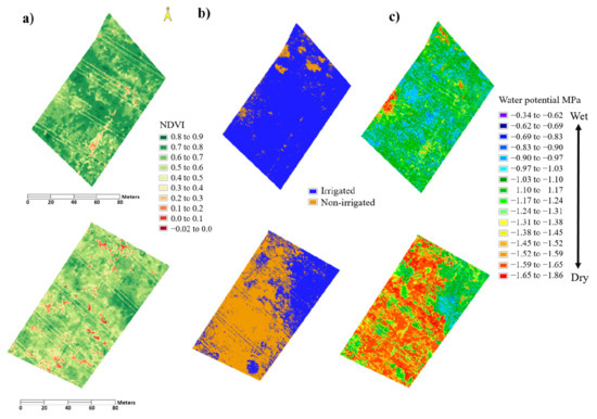 Processed scene images of irrigated (top images) and non-irrigated (bottom images) field sections over peak bloom. (a) Normalized difference vegetation index (NDVI) images of scenes. (b) Classified images of irrigated and non-irrigated scenes. (c) Predicted images of water potential.