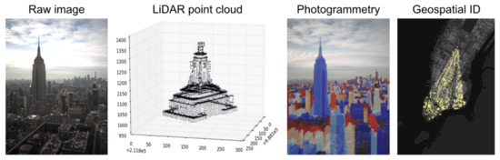 In order to maximize the utility of our UO facility, it is important that we be able to integrate the massive imaging data sets that we generate with available geospatial data including publicly available data such as census data, building-level energy consumption, fuel types, external sensor data (e.g., air quality sensors or radar data), etc. Our data fusion utilizes publicly available LiDAR data from NYC [81] to locate the 3-space coordinate that is covered by each pixel. Specifically, using the collinearity equations, we project the topographic LiDAR point cloud into the 2D-image plane (given the position, pitch, yaw, roll, and focus of the camera) and, for each pixel, choose the closest LiDAR point. Since the LiDAR resolution is ∼1 foot, there are pixel lines-of-sight for which the nearest LiDAR point is behind the nearest surface in that direction, and so we make a “no overhang” approximation and assign a given pixel the same 3-space coordinate as the pixel above it if the pixel above it is found to be closer to the camera. Finally, we use the publicly available MapPLUTO (Primary Land Use Tax-lot Output) data that contains the geospatial footprints for each building to associate the x,y components of the 3-space coordinate of a pixel with a given building footprint. Thus, we are able to tag each pixel as “observing” a given building (see Figure 2). Additional geospatial data at coarser resolution (e.g., census tracts, utility distribution zones, etc.) can be associated as well.