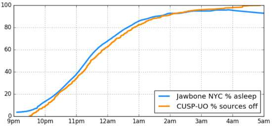An overlay of the percentage of sources “off” after 9:30 pm on a single Monday night (from UO broadband visible nighttime imaging of the scene in Figure 1) with the fraction of JawboneTM users asleep in NYC on Monday 31st March 2014. There is a clear correspondence between our observations of lighting variability and the aggregate circadian patterns of NYC.
