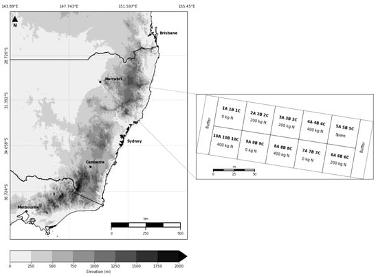The experimental site was in the north west of New South Wales (NSW), at the Australian Cotton Research Institute near Narrabri (see Figure 1). The main crops grown in the region are cotton and wheat. The predominant soil type in the region is a Vertosol and receives a mean annual rainfall of 592 mm with a mean maximum temperature during summer of 35 °C and a mean minimum during winter of 3 °C [59]. There were 10 plots of 30 m by 32 m with 3 replicates each of N treatments of 0, 200, and 400 kg ha−1 applied at sowing. The site was irrigated so water was non-limiting.