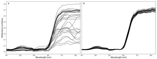 Hyperspectral reflectance at each georeferenced sample point, (a) from a single pixel, (b) from average of pixels within 20 cm.