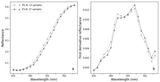 (a) mean spectral reflectance (b) mean derivatives in the red edge region for lower versus higher N plots.