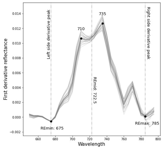 where R is the reflectance at λ wavelength, ordered by j = 1 … n and δλ is the bandwidth between wavelengths (5 nm in this dataset). The first derivative was smoothed with a filter using a 2nd order polynomial and 5 band fitting window [60].