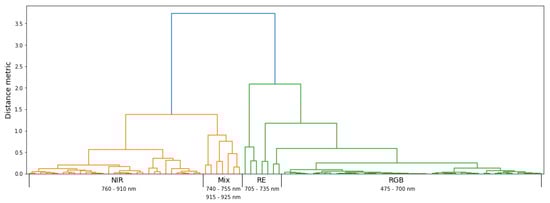 Hierarchical clustering showed the same split with bands < 740 nm in one cluster and those ≥ 740 nm in another (Figure 6). Further, the region 705–735 nm is separated in its own sub-group (labelled ‘RE’ in Figure 6). The grouping on the right side of the NIR main cluster (labelled ‘Mix’) is composed of 740–755 nm and 915–925 nm. While the ‘RE’ and ‘Mix’ regions have been clustered in separate larger hierarchies, both have similar and much larger distance metrics than either of the left and right extremes of the dendrogram (labelled ‘NIR’ and ‘RGB’ respectively).