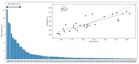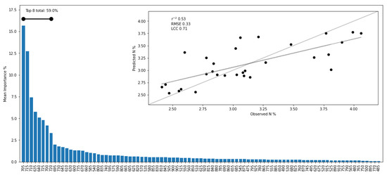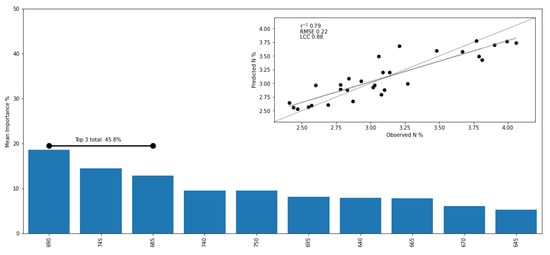 When applied to the derivative spectra, notable differences emerged from the reflectance in the bands identified in the supervised learning, with bands closer to the left and right slopes of the double peak feature being most important (685–695 nm and 740–750 nm). The regression using these 10 bands was able to explain 79% of the variation in the N samples, an improvement on the 74% when incorporating all 91 bands (Figure 10 and Figure 11).