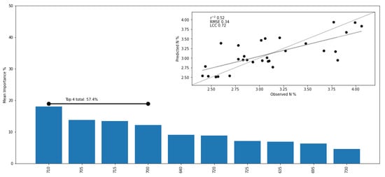 Random forest regression over the full 91 bands returned a similar grouping (Figure 7) showing the top 20 bands were between 540 nm and 715 nm. The red edge inflection point (705–715 nm) had the best mean importance across all cross validation increments with 35.8% total. When only the top 10 most important bands were analysed using random forest, the predictive ability was near identical, with the top four bands being at the red edge inflection point 700–715 nm and accounting for over half the relative importance (Figure 8). The top 15 bands subset returned no improvement over the top 10 bands (not shown).