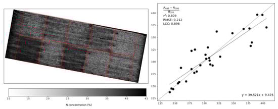 Both the hyperspectral and Sentinel data set were assessed in predicting leaf N concentration using ordinary least squares with leave one out cross validation. Results were compared using the coefficient of determination (2), root mean square error (3), and Lin’s concordance correlation coefficient (4):