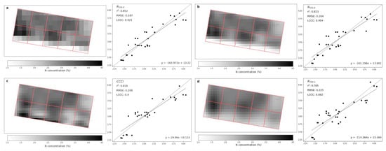 Sampled reflectance from the Sentinel bands had mixed performance in predicting N (Table 3; best 4 N predictions in Figure 13a–d). Out of the raw bands, Sentinel bands 3 and 5 each explained most of the variation in the N samples across the trial site, with the 10 m Green (B3) outperforming the Green at 5 m and all others. The VIs calculated from the Sentinel layers had a similar performance in predicting N to those derived from the hyperspectral data, with CCCI the best at predicting N with a slightly improved R2 (0.81 vs. 0.78) while was materially improved with R2 rising from 0.63 to 0.76. The two top performing hyperspectral VIs VOG1 and mND705 were much less effective in predicting N when calculated using the Sentinel layers, with VOG1 R2 dropping from 0.81 to 0.71). The Red Edge Point 1 band (B5) had a strong performance when downscaled to 5 m, but less so at its native 20 m resolution. The hyperspectral imagery was binned to match the discrete sentinel spectral ranges and tested, with the averaged hyperspectral bands matching the sentinel Red Edge Point 1 performing better than the Green region at predicting N concentration (R2 of 0.672, RMSE of 0.277, LCC of 0.807 and R2 of 0.433, RMSE of 0.364 LCC of 0.62, respectively).