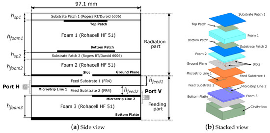 As a resonant structure, microstrip patch antennas typically provide a narrow bandwidth (3–4%). In order to overcome this issue and to fulfill the desired system bandwidth of 150 MHz (15%), a bandwidth enhancement technique has to be applied. It is well-known that the use of substrates with a lower dielectric permittivities, such as foam layers, provides greater antenna bandwidths. In addition, the use of electrically thick substrates along with the aperture coupled feeding allows for increasing the bandwidth. However, this may also lead to a reduction of the electromagnetic coupling between the feeding slot and the microstrip patch. Thus, further methods to attain a greater broadband performance are considered [34]. The dual stacked patch configuration involves the use of two patches with different sizes, thus resonating at slightly different frequencies. This way, and together with the use of foam layers, antenna bandwidths of up to 20–30% can be achieved [35].