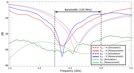The measured S-Parameters are depicted in Figure 4. Port 1 and 2 excite the horizontal and vertical polarization, respectively. The measurement shows an excellent agreement with the simulation. It can be seen that both polarizations achieve a return loss level below –10 dB within the bandwidth of 150 MHz. The center frequency of operation is slightly shifted (around 3%) towards lower frequencies, due to fabrication and construction tolerances. The port isolation between both polarizations is greater than 30 dB at the center frequency of operation.