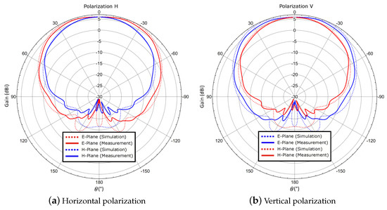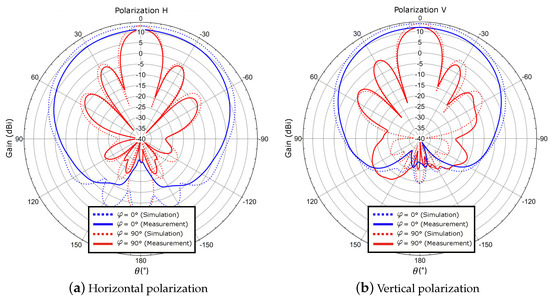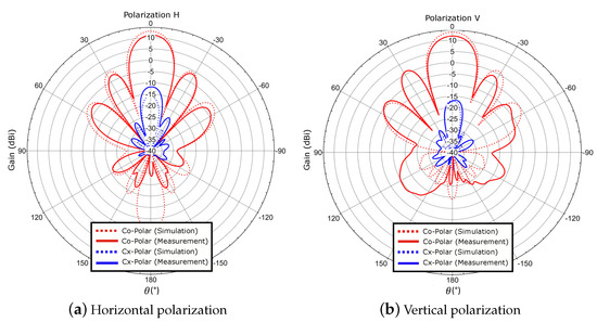 For this case, each element is fed with equal power level and phase, thus achieving a broadside radiation. The same phase value is guaranteed by means of self-manufactured cables with identical electrical length. Figure 8 shows a comparison between simulation and measurement of the co-polar patterns for both polarizations. Co-polar and cross-polar patterns for are depicted in Figure 9. The measured gain is 11.1 dB and 11.7 dB for the horizontal and vertical polarization, respectively. It differs 1.7 dB from the simulated values, since the power divider used to obtain a uniform amplitude distribution for each antenna element and the cable losses are not considered within the calibration process. This includes the insertion losses related to the power divider and the inherent power losses given by the unused output of the power divider that is matched with a 50 load. Precisely, due to the slight phase and amplitude unbalance at the outputs of the power divider [38], the pattern at is marginally assymetric, being more visible for the vertical polarization. However, it can be seen that the measurements agree very well with the simulated values.