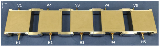 The first configuration to be analyzed corresponds to the standard case of the linear array arrangement, where all the antennas are identically aligned. This standard configuration will be identified as a normal array, and it is considered as a reference case for later comparisons. The geometrical arrangement of this configuration is depicted in Figure 7. Each antenna is interconnected by means of intermediate aluminum blocks that provide an interelement spacing of 0.6. The element numeration starts from the left. All the connectors that feed each polarization (, ) are placed along the same side of the array.