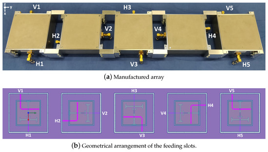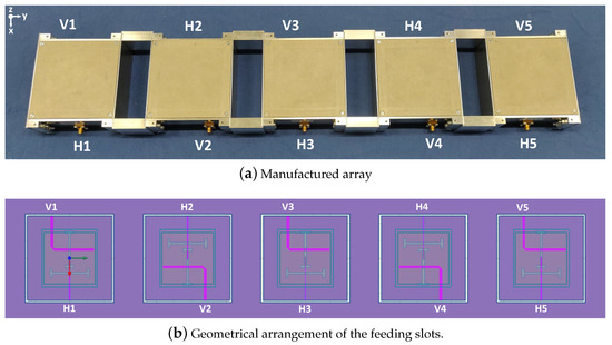 The geometrical 90° rotation involves an exchange of the polarization excitation of the antenna elements 2 and 4. This has to be considered, since, for a given array polarization, different slot arrangements of the antenna elements are used. Electrically, this leads to a different feeding phase from which each antenna is fed, since the coupling slot involved in the antenna elements 1, 3, 5 and 2, 4 is not the same, with each slot being excited by means of microstrip lines with unequal electrical lengths, since they are placed on different substrate heights (Figure 2). Thus, a phase addition has to be applied in order to compensate such electrical length variation of the microstrip lines that feed the slots. The resulting geometrical arrangement of the feeding slots can be seen in Figure 14.