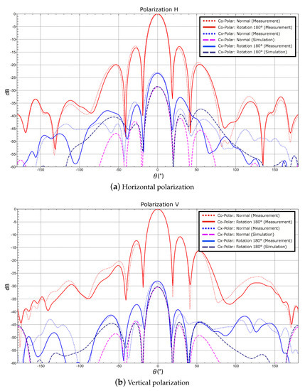 A comparison between the normal array and the array with the sequential 90° rotation of the antenna elements, when applying uniform amplitude and phase, is depicted in Figure 15. It can be seen that both configurations provide the same co-polar pattern with broadside radiation, with slight differences regarding the side lobe level of the vertical polarization. The measured cross-polarization is again higher than the simulation, as it is experienced in the previous measurements. However, it can be stated that the cross-polarization performance of the array with the sequential 90° rotation is considerably enhanced within the main beam with the penalty of increasing it in the ranges but far beyond the antenna main beam. The measured improvement at is almost 10 dB and 8 dB for the horizontal and vertical polarization, thus achieving a measured cross-polarization suppressions of 32 dB and 36 dB, respectively, which still remain below the simulated values. This slightly difference can be expected, since the measured range of the cross-polarization values are relatively low in the logarithmic scale, leading to an extremely sensitive measurement. It has to be also considered that the antenna elements are not exactly identically constructed due to fabrication tolerances and manufacturing processes. It can be also seen that the measured cross-polarization patterns agree with the predicted simulation data.