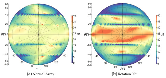 A comparison in terms of cross-polarization suppression of the normal array and the array with the sequential 90° rotation of the antenna elements is shown in Table 6. A polar representation of the cross-polarization suppression values is depicted in Figure 16. It can be seen that with the sequential 90° rotation, a great improvement regarding the cross-polar suppression within the antenna main beam is achieved.