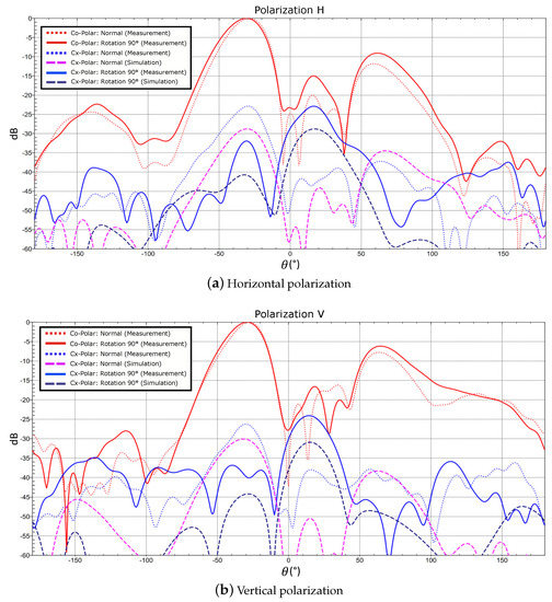 The performance of this configuration is compared with the normal array in Figure 17 when beamforming is applied. Both array configurations provide a similar co-polar patterns, as expected. Despite the fact that the measured cross-polar level for the horizontal polarization at the antenna main beam direction is higher than the simulated value, it remains 10 dB below the measured value for the normal array. The measurement of the vertical polarization shows an improvement of almost 14 dB in comparison with the normal array, achieving a cross-polarization suppression of 40 dB. The sequential 90° rotation of the antenna elements also provides a shift of the cross-polarization maximum beyond the antenna main beam. The overall measured cross-pol pattern meets the simulated data, which demonstrates the improvement of the cross-polarization performance by means of the presented 90° rotation approach. An overview in terms of the cross-polarization suppression values of this configuration and the normal array, when applying beamforming, is shown in Table 8 and Figure 18. The polar plot provides an additional angular representation, where the improvement achieved in the antenna main beam direction is clearly seen, especially all over the direction . A more symmetric cross-polarization pattern is also achieved, with a deterioration in the angular range , far beyond the direction of the main radiation.