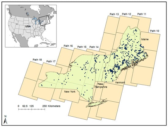 This study focused on lakes with surface areas of at least 150 ha in the US states of Maine, New Hampshire, Vermont, and New York. Though there is a considerable body of literature on remote sensing of lake water clarity in the midwestern USA [14,24,40,56,57], this study area is primarily forested and contains a large number of clear water lakes with long-term in situ measurements [58] (Figure 1). Although water quality in this region is of tremendous environmental, recreational [59], and economic importance [4,5], few algorithms are available to estimate Secchi depth in clear water systems.