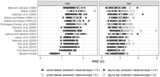 MAE for the training (left) and test (right) subsets, for the whole dataset (triangle) as compared to the day-by-day analyses (circles). Icons for the datasets are colored by the slope of the relationship between predicted and observed. Unfilled circles indicate a static predicted Secchi depth (predicted-observed slope < 0.1), gray fill indicates some response in the predicted Secchi depth such that there is a positive slope (>=0.1) in the relationship between predicted and observed Secchi depth. Note the difference in the x-axis scale between the two panels.