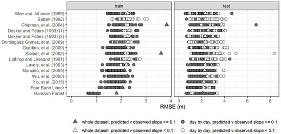 RMSE for the training (left) and test (right) subsets for the whole dataset (triangle) as compared to the day-by-day analyses (circles). Icons for the datasets are colored by the slope of the relationship between predicted and observed. Unfilled circles indicate a static predicted Secchi depth (predicted-observed slope < 0.1), gray fill indicates some response in the predicted Secchi depth such that there is a positive slope (>=0.1) in the relationship between predicted and observed Secchi depth. Note the difference in the x-axis scale between the two panels.