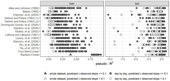 Pseudo-R2 for the training (left) and test (right) subsets for the whole dataset (triangle) as compared to the day-by-day analyses (circles). Icons for the datasets are colored by the slope of the relationship between predicted and observed. Unfilled circles indicate a static predicted Secchi depth (predicted-observed slope < 0.1), gray fill indicates some response in the predicted Secchi depth such that there is a positive slope (>=0.1) in the relationship between predicted and observed Secchi depth. Note the difference in the x-axis scale between the two panels. This figure has been truncated at −0.25 in the training set and −11 in the test set, and in doing this, 3 points were excluded: the whole dataset training result for Chipman et al. (pseudo-R2: −1.73) and Kloiber et al. (pseudo-R2: −1.41) and a single-date model testing result for Kloiber et al. (pseudo-R2: −44.71). A full-scale figure is included as Supplementary Figure S6.