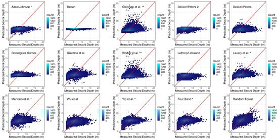 Training dataset model output for the overall dataset. Panels with a single asterisk (“*”) after the model indicate that there are values that are not displayed because there are negatively predicted Secchi. Panels with two asterisks (“**”) indicate that there are values that are not displayed because they are outside of the bounds of the limits displayed here (maximum Secchi depth displayed is 20 m).