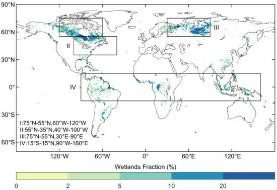The MODIS land use and landcover map (MCD12Q1) in 2001, with an overall accuracy of 75% from the cross-validation accuracy assessment [20], were used to distinguish wetland, forest, shrubland, and open land pixels. This dataset encompasses 17 landcover classes proposed by the International Geosphere–Biosphere Program (IGBP), of which class 11, class 1–5, class 6–9, and class 10, 12, 14 represent permanent wetlands, forest, and open lands, respectively. Open lands include cropland, grassland, or a mix of cropland and grassland. The absolute area and the fraction of the land surface area of the 17 classes are summarized by the statistics in Table 1. According to the IGBP classification, only permanently inundated lands with 30–60% water cover and >10% vegetated cover were identified as wetlands, such that in the following analysis global natural wetlands covered only 0.73% (1.1 million km2) of the land surface area (see Table 1), which is much less than those in other studies where the seasonally inundated wetlands are included [1]. Note that the area of permanent wetlands in 2001 was the lowest during the period 2001–2017. We used the landcover map of 2001 as the minimum area of wetlands. We also tested that our results were robust with landcover maps of other years.
