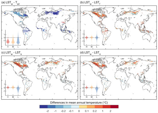 Spatial patterns of difference in land surface temperature (ΔLST) between wetlands and air temperature (; a), (, and ) wetlands and forests (; b), wetlands and shrublands (; c), and wetland and open lands (; d) during the period 2001–2017. Regions labeled by black dots indicate values that are statistically significantly positive or negative (t-test; p < 0.05). In each subplot, the violin plot in the left-bottom panel summarizes the statistics in the high-latitude (>60°N, denoted by H), middle-latitude (30°N–60°N, denoted by M), and low-latitude (30°S–30°N, denoted by L) regions.