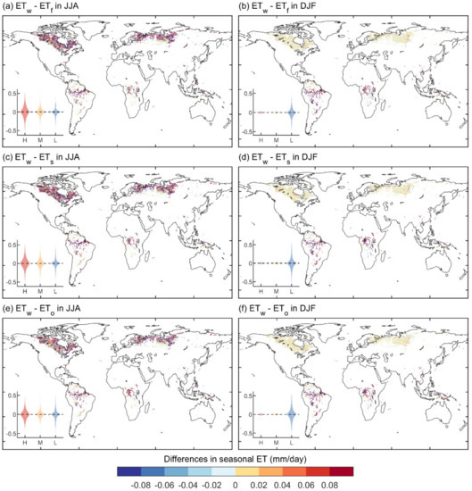 Figure 5 shows the spatial pattern of ΔET of JJA and DJF between wetlands and forests (, Figure 5a,b), wetlands and shrublands (, Figure 5c,d), and wetlands and open lands (, Figure 5e,f). ΔET of MAM and SON are shown in Figure S5. Similar to Δalbedo, in tropical regions, ΔET had an almost consistent pattern throughout the year, while in the boreal regions ΔET had distinct patterns between summer and winter. Specifically, in tropical regions, ΔET had similar values (i.e., 0.00 ± 0.20, 0.00 ± 0.25, and 0.01 ± 0.28 mm/day for , and , respectively) and had little seasonality. In boreal regions, although ΔET had negative values throughout the year; the absolute values of ΔET decreased as the season shifted from summer (0.00 ± 0.18 mm/day) to winter (0.01 ± 0.02 mm/day).