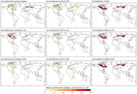 Relative contributions of Δalbedo and ΔET to ΔLST in the entire seasonal cycle (a–c), and in summer (d–f), and winter (g–i).