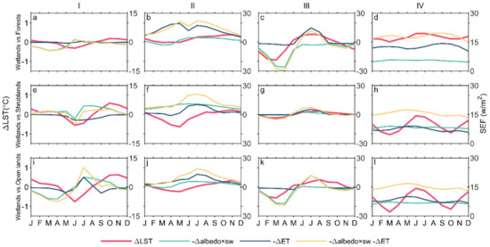 The following are available online at https://www.mdpi.com/article/10.3390/rs13081439/s1, Table S1: Statistics of ΔLST, Δalbedo, and ΔET in four regions; Figure S1: Spatial patterns of mean annual air temperature and LST of wetlands; Figure S2: Spatial patterns of mean annual albedo of wetlands; Figure S3: Differences in seasonal LST between wetlands, forests, and open lands; Figure S4: Differences in seasonal albedo between wetlands, forests, and open lands; Figure S5: Differences in seasonal ET between wetlands, forests, and open lands.
