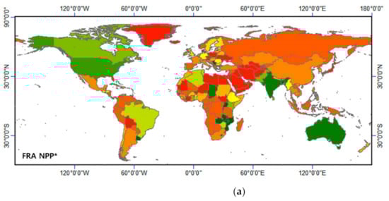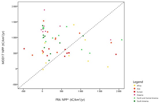 The scatter plot of the MOD17 NPP versus the FRA NPP* also indicated the evidence of discrepancies between the two NPP estimates (Figure 4). Moreover, there was no strong statistical relationship between them. Surprisingly, these two NPP estimates were not even positively related. The discrepancy patterns differed across regions. For almost all countries in South America, their MOD17 NPP was higher than their FRA NPP*. Approximately an equal number of African countries had MOD17 NPP values either higher or lower than their FRA NPP*. Most countries in other regions had MOD17 NPP values higher than their FRA NPP*.