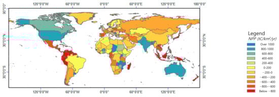 NASA use the MODIS satellite data to calculate the NPPs of the world’s terrestrial ecosystems at a 1 km2 spatial resolution of earth surface []. Their NPP estimate is based on the amount of solar energy absorbed by plants, which is measured by the satellite sensor, adjusted for the differences between the theoretical and practical solar energy absorption efficiencies of plants. Specifically, the MODIS algorithm is based on the original radiation use efficiency and considers vegetation type, water stress, and cold temperature conditions, as well as daily leaf and fine root maintenance respiration, annual growth respiration, and annual maintenance respiration of live cells in woody tissues []. The MOD17A2 data of validation stage 3, which were collected by the TERRA satellite, were used in this study. The monthly NPP data were extracted only for forests. The monthly average NPPs in 2015 were downloaded directly from the NASA Earth Observations website [] and aggregated into annual NPP values for each country using the following formula: