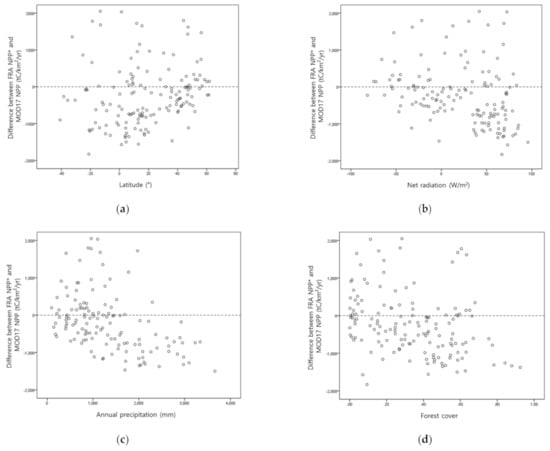 The relationships between the discrepancy in the two estimated NPPs and each of the biophysical and socioeconomic factors are shown in Figure 5. There are a few factors that can help explain the discrepancies. They are NDVI, LAI, net radiation, annual precipitation, and forest cover, mirroring those that are correlated with the MOD17 or FRA NPP*. The magnitude (absolute value) of discrepancies between the two NPP estimates increases with a rise in the value of these factors. The MOD17 NPP is more likely to be greater than the FRA NPP* in countries with net radiation > 70 W/m, annual precipitation > 2000 mm, forest cover rate > 0.4, NVDI > 0.7, or LAI > 2.5. The variance of the discrepancies, on the other hand, tends to diminish as the values of these factors increase.