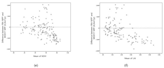 The MOD17 NPP was nonlinearly correlated with several biophysical factors, especially NDVI, LAI, net radiation, and annual precipitation. This is consistent with the NPP definition and the principles embedded in the MODIS algorithm [,]. On the contrary, the FRA NPP* showed no correlation with any of these biophysical factors except forest cover. The ratio of forest cover (ratio of forest area to total land area) was moderately correlated with the FRA NPP*. Furthermore, the variations of the FRA NPP* tend to decrease as the ratio of forest cover increases.