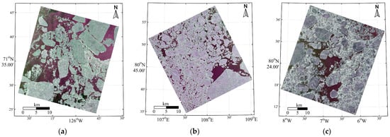 A Lee filter was applied to reduce the speckle noise. The Lee filter accentuates the edges between ice and water with an insignificant loss of texture features. A window size of 5 × 5 pixels was used. The calibrated GF-3 SAR backscatter coefficient data was used as inputs to the adaptive Lee filter. After calibration and speckle filtering, we rescaled the backscatter coefficient dB range into a digital range of 0–255 for each region. The scaling of each region was performed for each image separately. The limits of the rescaled backscatter coefficient were set to 1.5% and 98.5% of all the polarization ranges in the given region. We then combined the different polarization data (, , and ) into RGB format, in preparation for the input into the deep learning scheme. Figure 2 shows the color composite images of the R1-1, R2-6, and R3-15 scenes (the first two alphanumeric letters are the region designation and the third number is the ID of the scene as listed in Table 1).