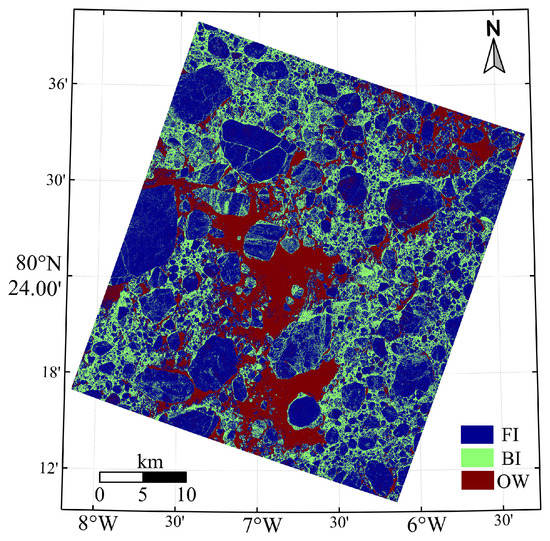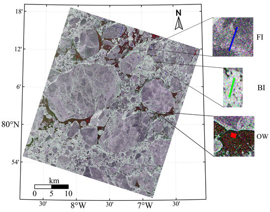 The World Meteorological Organization (WMO) has defined seven major sea ice categories based on the ice development stage [32]. However, it is impractical to identify all these categories, especially in late spring and summer scenes when young ice types do not exist, and flooded ice surfaces can mask the underlying ice type in radar images. This results in MYI (which has a distinctly high backscatter in winter) and first-year ice (FYI) having similar radar signatures in summer. The surface deformation form, which is caused by the collision and convergence of mobile ice floes, makes the backscatter high in SAR images in both co- and cross-polarization [33]. However, the deformation may become eroded in summer or covered with wet snow, both of which reduce the backscatter. BI may also continue to exist between ice floes, and its roughness results in relatively high backscatter. Therefore, in this study, three surface categories were considered: floe ice (FI), brash ice (BI), and open water (OW). The FI category combines FYI and MYI, both of which are commonly of round or elliptical shape, with medium backscatter. The BI category represents the crushed ice between ice floes, and OW denotes the ice-free area, which has the lowest backscatter coefficient, because of its relatively smooth surface.