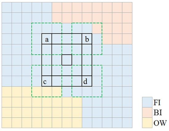 For each pixel in the labeled area of each type, the pixel and its neighboring pixels in the composite SAR image were extracted as a patch. Each patch was considered to represent a single surface type, i.e., the type of the center pixel. Figure 4 depicts a virtual segment in an image, with the three colors representing the three surfaces of FI, BI, and OW. For instance, the black outer boundary represents the labeled area, with all the pixels inside representing the FI surface. For each pixel within the labeled area, a window is established. This is shown in the dotted lines for pixels “a”, “b”, “c”, and “d”. The window is 3 × 3 pixels in this example, where the window constitutes one patch. With the changing of the window size, the surface type information contained in a given patch becomes different. To determine the most appropriate information content for GF-3 QPS mode data for the algorithm, four patch sizes were tested in this study, i.e., 25 × 25, 31 × 31, 37 × 37, and 43 × 43. All the pixels within a patch constituted a training sample, which was used as the input for the deep learning network. As a patch may contain peripheral pixels, the surface types of the pixels within the same patch can be different. As the VV, VH, and HH polarizations were considered, each image patch was a 3-D matrix of size, 31 × 31 × 3. The number of generated patches is equal to the number of pixels in all the labeled area. Of the generated patches, 80% were randomly selected as training data, and the other 20% were used for the validation. We did not reject any training data. The number of training samples for the R1, R2, and R3 scenes were 207,409, 219,888, and 344,043, respectively, and the ratios of FI, BI, and OW were about the same in each scene.