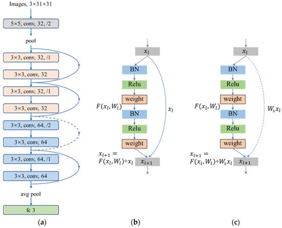 The dimensions of and must be equal in Equation (2) to conduct the addition operation. In another case (Figure 5c), as shown in the third residual block in Figure 5a, the number of channels and the size of each channel have changed which will cause the inputs and outputs to have different dimensions as mentioned above. To achieve the addition operation for and , a convolution operator is needed for to make the convolved and have the same channel number and size. The calculation formula is: