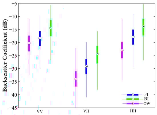 The average user’s (producer’s) accuracy for FI, BI, and OW is 89.51% (94.77%), 91.83% (81.13%), and 88.65% (87.55%), respectively, when considering the VV, VH, VV + VH, and VV + VH + HH polarization combinations together. This also shows the approximate order of the feasibility of the identification of each surface.