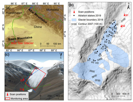 (a) Location map of the Sawir Mountains and Muz Taw Glacier (red solid circle); (b) The glaciological mass-balance measuring network in 2019 (the background is from the ALOS (Advanced Land Observing Satellite) digital elevation model (DEM)), and the numbers denote elevations of the contours; (c) Spatially distributed scan positions (S1 and S2) and the extent of the terrestrial laser scanning (TLS) surveyed area (red rectangle) (the background is from Google Earth).
