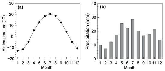 Muz Taw Glacier (47°04′ N, 85°34′ E) is a northeast-faced valley glacier that is situated on the northern side of the Sawir Mountains (Figure 1), with an area of 3.13 km2 and a length of 3.2 km in 2016 [33]. Glaciological investigations of Muz Taw Glacier were initiated in 2013, and subsequently, an observation and research station (Altai Observation and Research Station of Cryospheric Science and Sustainable Development, Chinese Academy of Sciences) was set up for the long-term measurements. According to the latest observations, the glacier area decreased continuously with a value of 10.51 km2 (45.72%) over the period 1977–2017, and the mean annual length change (front variation) reached up to 11.5 m a−1 from 1989 to 2017 [17]. The glacier is controlled by the prevailing westerlies in a continental climate setting, Jimunai Meteorological Station (984 m a.s.l., located about 46 km northeast of the glacier) showed that the average annual air temperature and precipitation were 4.3 °C and 212 mm, respectively, during the period 1961–2016. Both annual air temperature and precipitation presented an increasing trend with rates of 0.4 °C (10 a)−1 and 12 mm (10 a)−1, respectively. High air temperature mainly occurred from May to August, and air temperature was very low during winter. The annual distribution of precipitation was approximately homogeneous and precipitation in July was relatively high, and the winter precipitation accounted for 10–30% of the annual total (Figure 2).