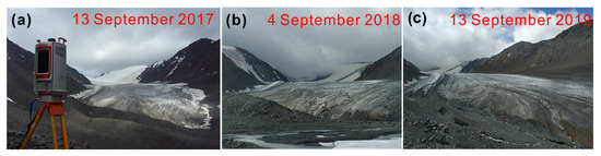 As mentioned above, we utilized the Riegl VZ®-6000 TLS to acquire the glacier surface terrain. The TLS was produced by Riegl Laser Measurement Systems GmbH (Austria) in 2012 with a weight of 14.5 kg, and it was dust- and water-proof. The continuous operating voltage and air temperature range from 11 to 32 V and from −10 to 50 °C, respectively. The device can offer a maximum measurement range of 6 km for natural targets and high-speed data acquisition of 222,000 points per second. The angle measurement resolution is better than 0.0005° (1.8 arcsec), and laser divergence is 0.12 mrad (equivalent to an increase of 12 mm of beam diameter per 100 m distance). The scanning range ranges from 0 to 360° horizontally and from 60–120 °vertically (from zenith). The Riegl VZ®-6000 TLS is a well-established tool for measuring snowy and icy terrain even at long distances, since the device operates at the wavelengths in the near-infrared band (class 3B laser beams, 1064 nm), which enables high rates of reflection (>80%) [31]. Note that the volume-to-mass conversion factor is a fundamental issue for geodetic mass balance calculations (see Section 3.2); the TLS surveys are ideally carried out at the end of the ablation season to reduce the influence of fresh snow. Here, point clouds of the ablation area were acquired by the TLS surveys implemented on 13 September 2017, 4 September 2018, 13 September 2019, and 15 September 2020, and the ablation area was mainly covered with bare ice on the days of the TLS surveys (Figure 3). Specific measurements included three procedures.