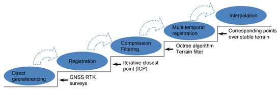 Schematic illustration of the workflow used for point cloud processing. “GNSS” is the abbreviation of “Global Navigation Satellite System” and “RTK” is the abbreviation of “real-time kinematic”.
