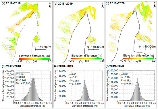 Surface elevation changes over stable non-glacier terrain are used to evaluate the accuracy of DEM differencing, which exhibited normal distribution (Figure 6). Our statistics suggested that more than 80% and 90% of the total pixels with elevation changes fell in the confidence intervals of 2 × sigma and 3 × sigma, respectively, indicating that the accuracy of DEM differencing should be limited to the decimeter level. This may be related to fixed scan positions and the use of multi-temporal registration [38]. According to the point clouds over stable terrain, here, multi-temporal registration was used indispensably to correct the misalignment of two consecutive scan campaigns in the horizontal and vertical orientation via ICP algorithms due to the lack of in situ-measured ground control points [21,39].
