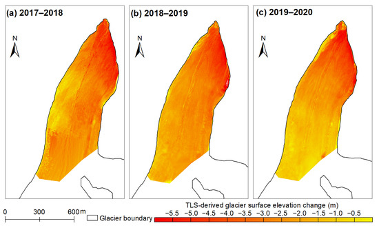 On average, the uncertainty of TLS-derived geodetic mass balance was 0.11 m w.e. a−1 for the three investigated periods (Table 2). The accuracy of our results was close to the studies that used high-precision 3D laser scanning, such as Hintereisferner in Austria, with a mean error of 0.07 m w.e. a−1 [47], four very small glaciers in Switzerland, with a mean error of 0.13 m w.e. a−1 [21], and Echaurren Norte Glacier in Chilean Andes, with a mean error of 0.09 m w.e. a−1 [55]. However, the uncertainty estimated in our study was smaller than the similar studies that used coarse DEMs (e.g., [56,57,58]), confirming the high precision of the TLS surveys. Note that this study only focused on glacier mass balance in the ablation area, and uncertainties in estimated accumulation had not been considered, which probably improved the accuracy of geodetic mass balance [59].