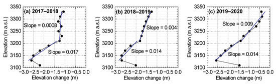 The altitudinal distribution of glacier elevation changes is a combination of glacier surface mass balance and dynamic processes (emergence/submergence velocities). The altitudinal profiles of glacier surface elevation changes were depicted in Figure 8 and showed thinning continuously decreased with increasing of altitude, which was a commonly changing behavior and agreed well with the knowledge of existing in situ measurements [8]. The altitudinal gradient was about 0.69 m (100 m)−1, 0.60 m (100 m)−1, and 0.95 m (100 m)−1, for the mass-balance years 2017–2018, 2018–2019, and 2019–2020, respectively, which showed a positive correlation (R2 = 0.93) with observed glacier mass balance, indicating that a higher altitudinal gradient of glacier surface elevation changes usually resulted in less mass loss. The gradient of altitudinal elevation changes was commonly steep at the low elevations and gentle in the upper-elevation parts (the turning point occurred at the altitude of 3210 m a.s.l. for all of the three periods). In addition, reduced surface lowering occurred at the glacier terminus, which was consistent with the glaciological mass balance versus elevation of most reference glaciers reported by [8].