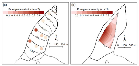 Emergence velocity at each ablation stakes (a), interpolation of the spatially distributed emergence velocity by a kriging method (b) for the mass balance year 2018–2019.