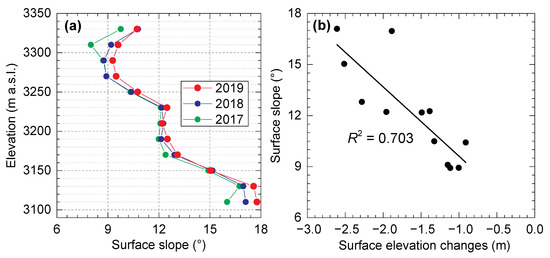 (a) Altitudinal distributions of glacier surface slope in 2017, 2018, and 2019. (b) Correlation between the mean glacier surface slope and elevation changes over the three periods.