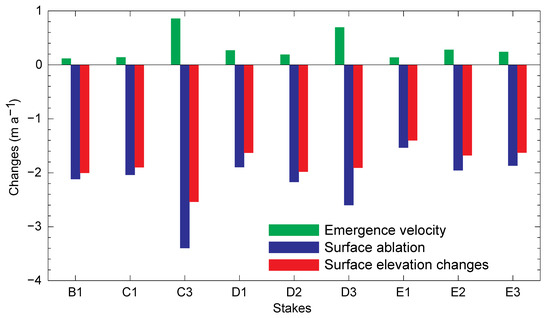 Here, we mainly considered the measured errors in the ablation area and the calculated error was about 0.03 m w.e. a−1. Due to surface elevation change in the ablation area is the arithmetic sum of mass balance and the emergence velocities (), the uncertainty in emergence velocity can be calculated applying a reciprocal density conversion: